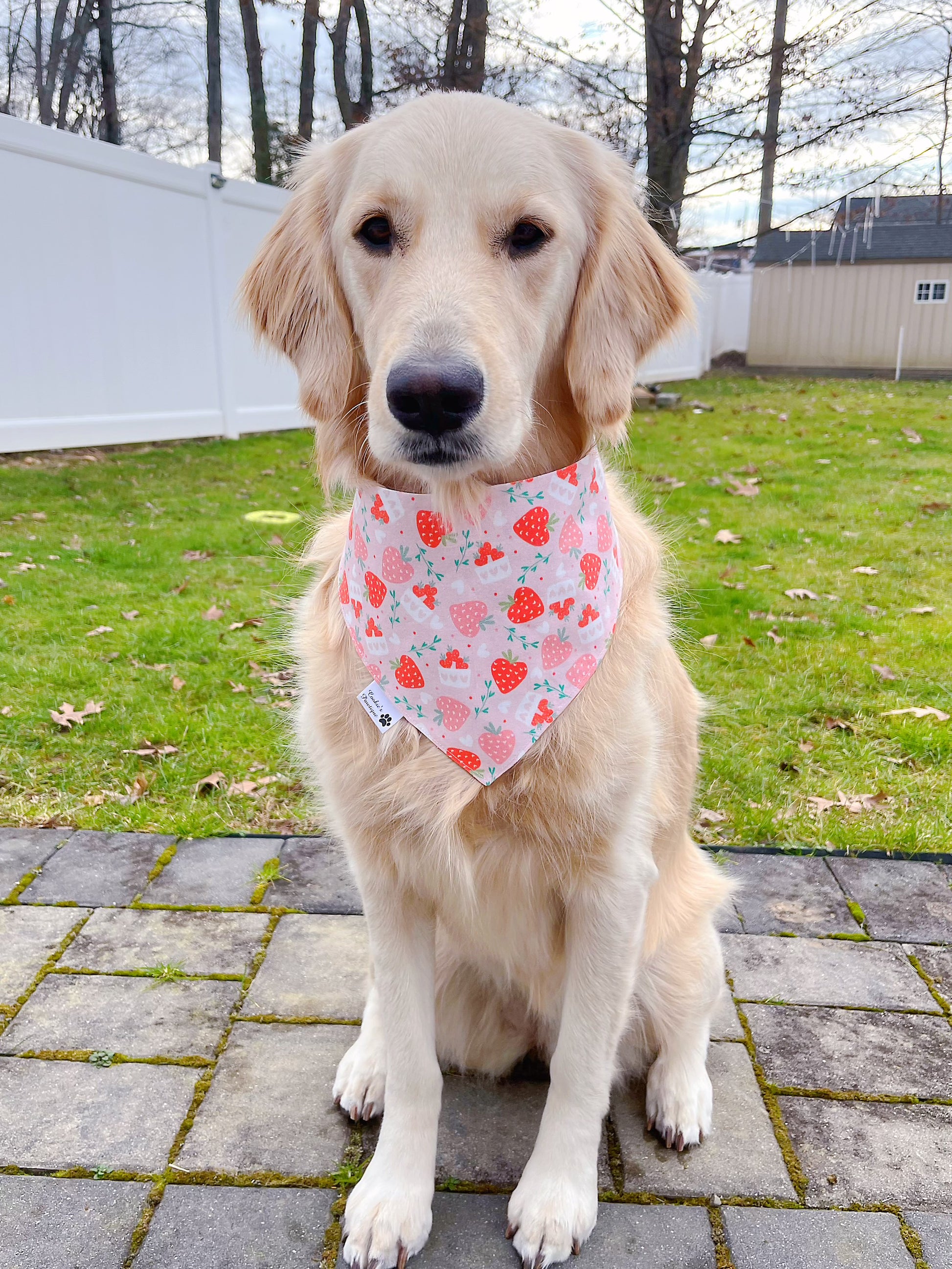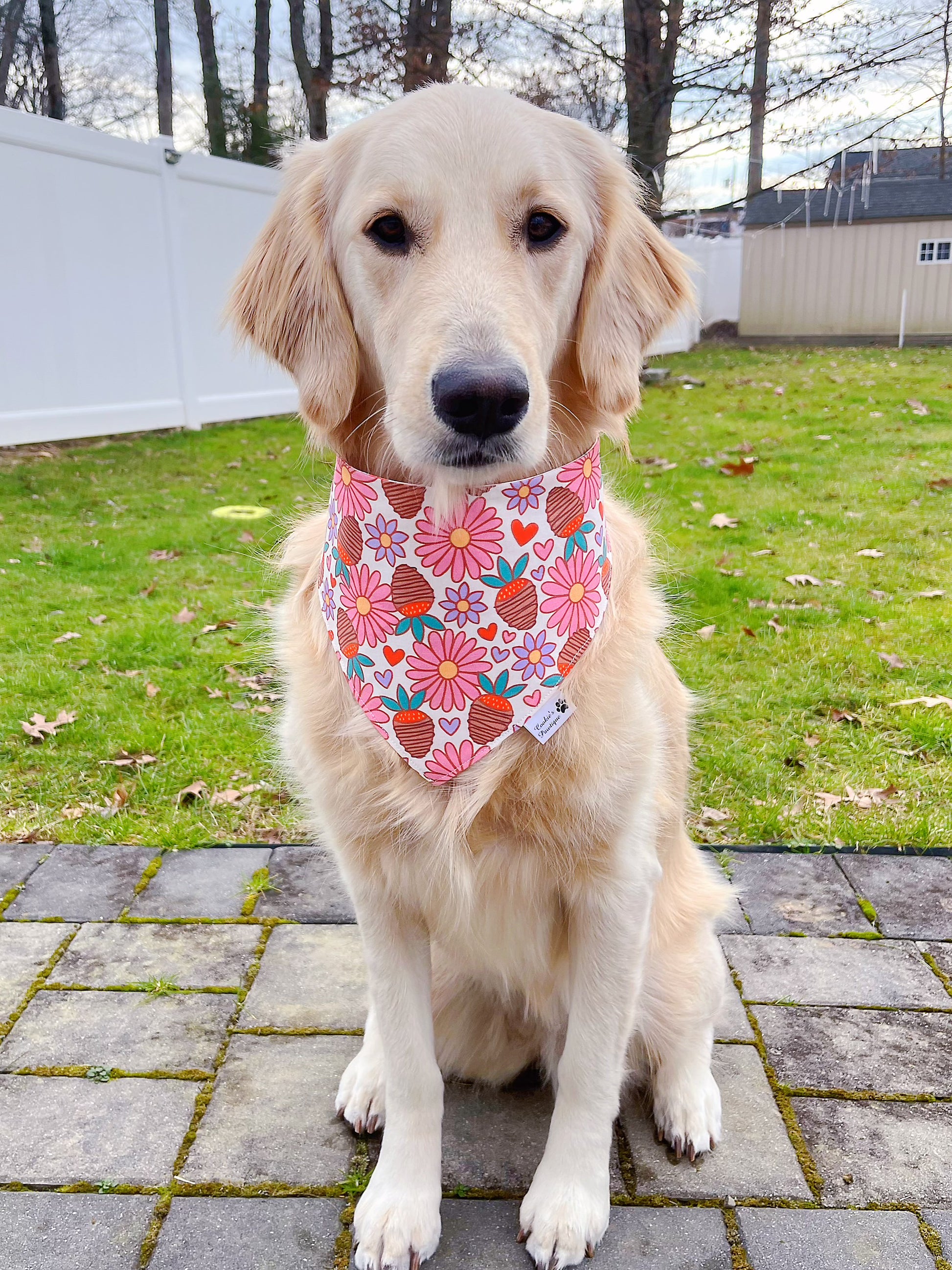 Model Info: Cookie, a 70-pound Golden Retriever with a 19'' neck, wears a size large in over-the-collar, tie-on, and snap-on bandanas for all of our products.