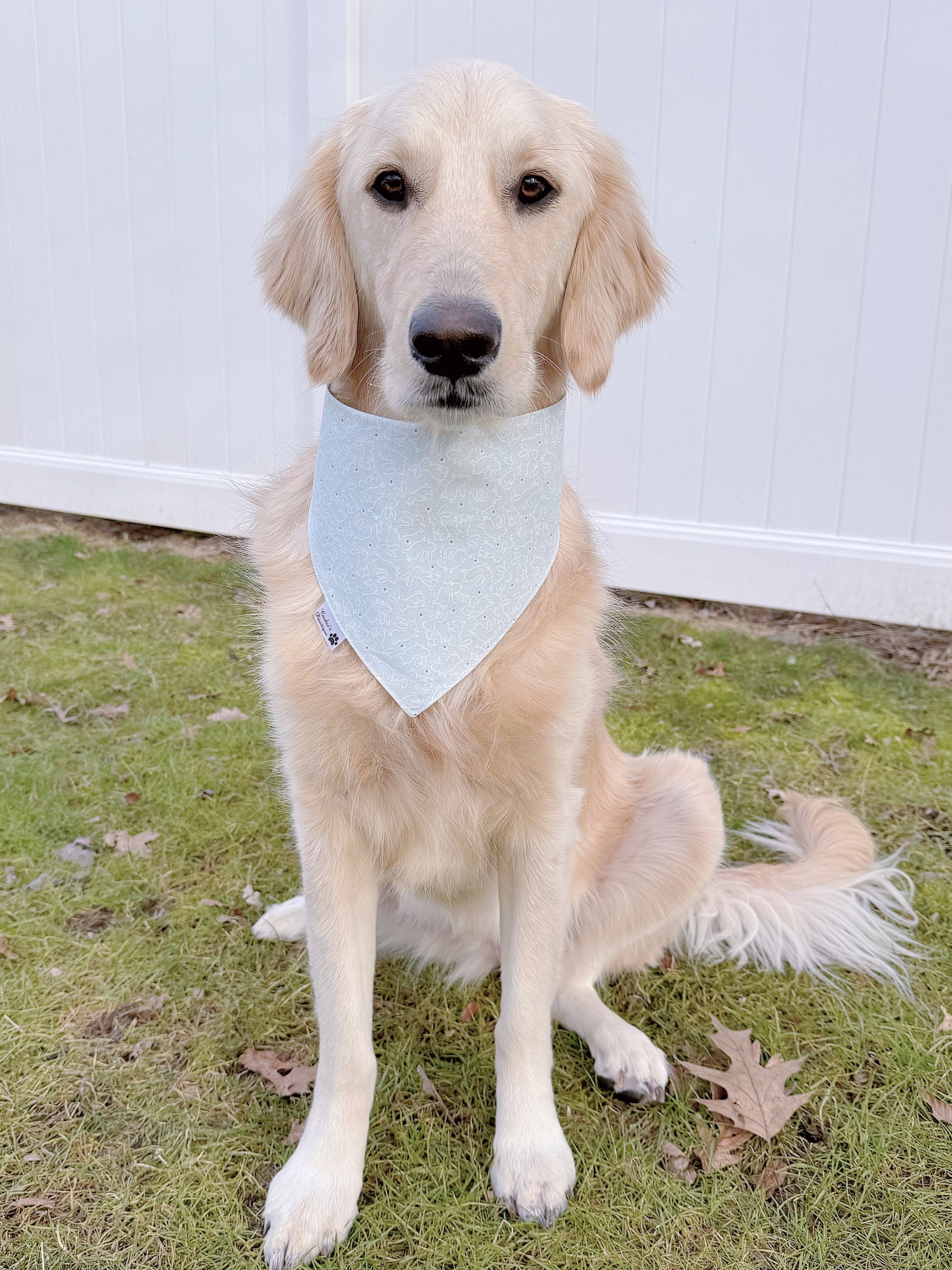 Model Info: Cookie, a 80-pound Golden Retriever who has a 20’’neck, is wearing size large for both slip-on and tie-on bandanas in all our products.