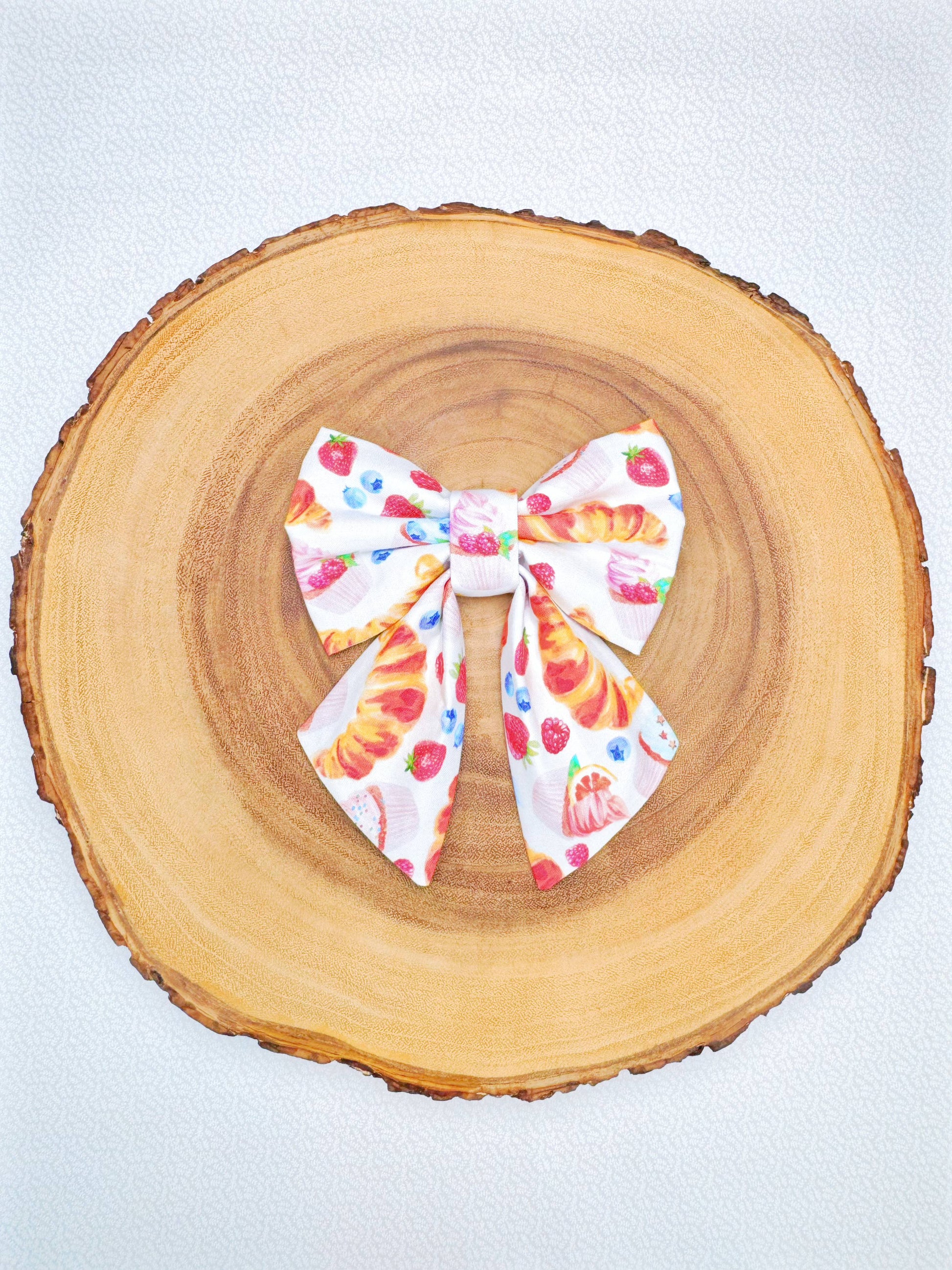 All our bow ties and sailor bows are handmade, each with two elastic straps at the back to easily slide over the collar. Since they're handmade, each product may vary in design, including color, pattern placement, size, and shape. This uniqueness means no two bows are exactly the same.