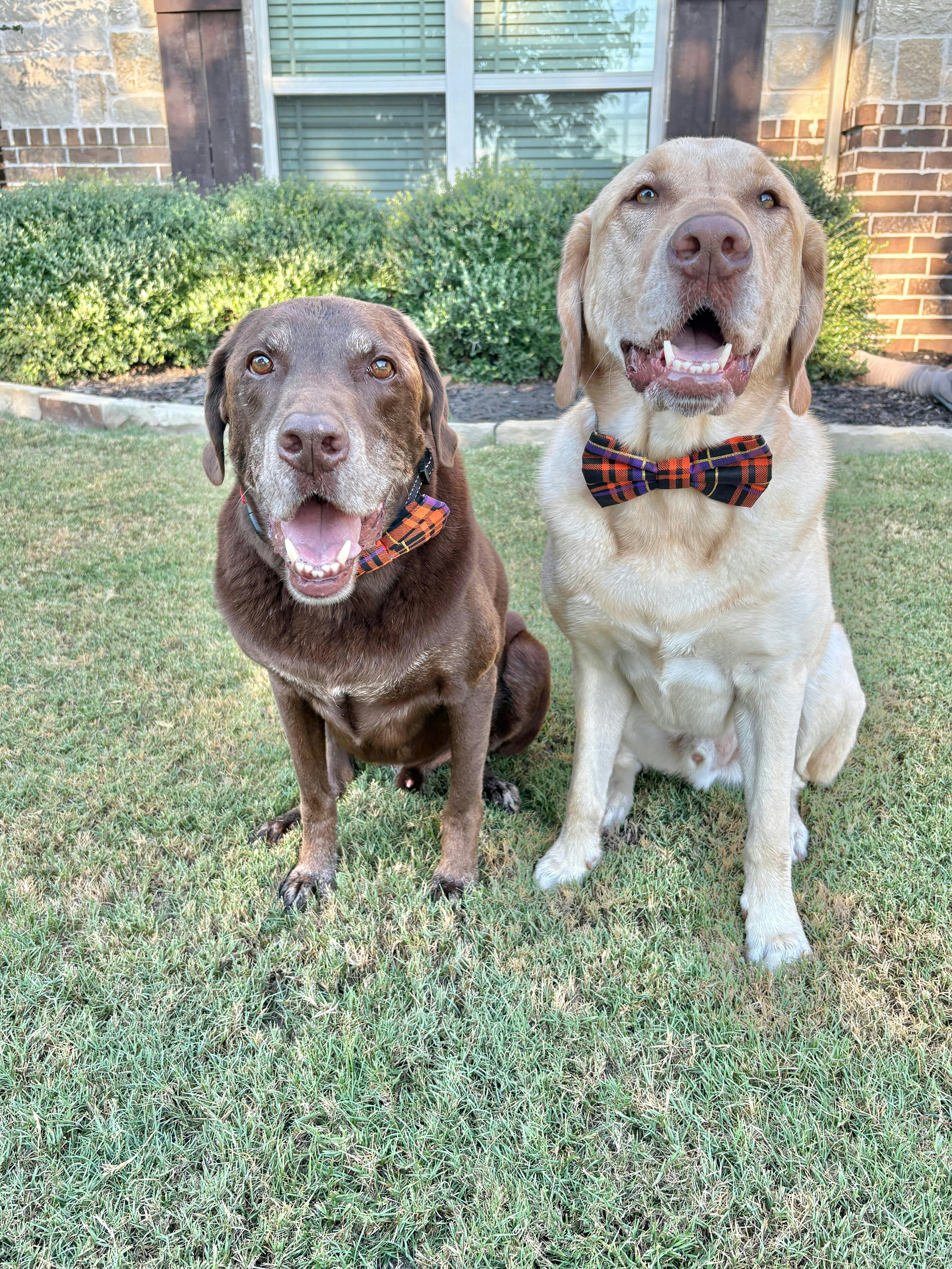 Model Info: Cookie, an 70-pound Golden Retriever with a 19'' neck, is wearing size large sailor bow and bow tie across all our products.