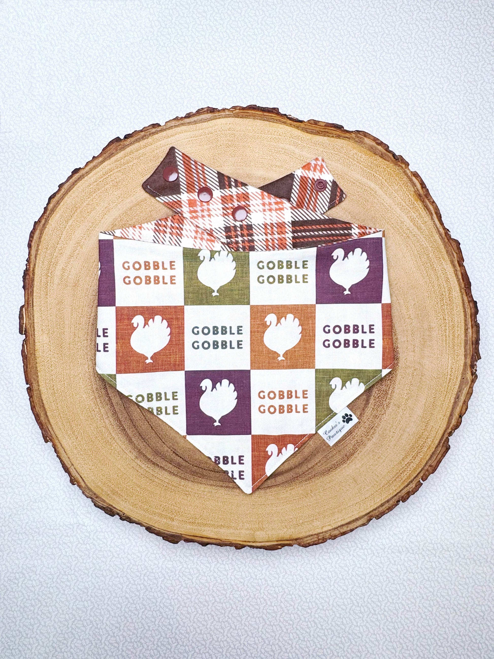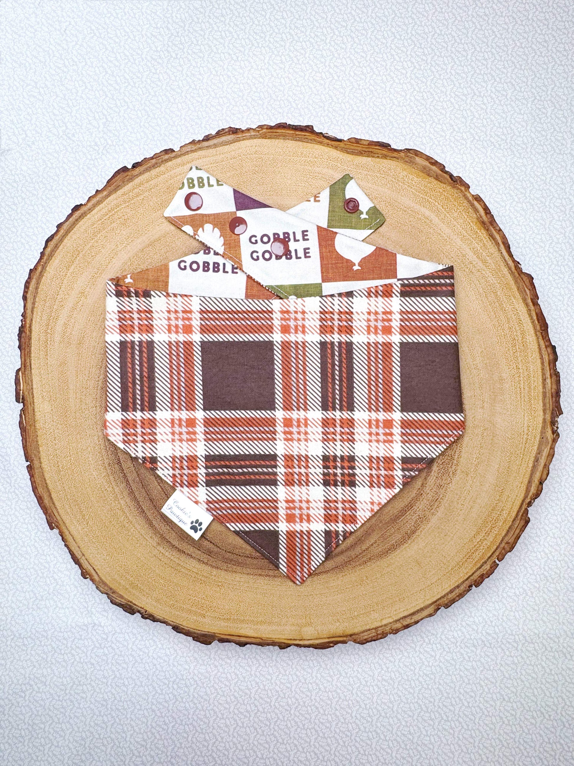 This is a reversible bandana that features two bandanas in ONE! Made with high-quality and trendy fabrics, and designed with your dog's comfort in mind, it is a PAWFECT accessory to add some flair to your best furry friend's look for Thanksgiving.