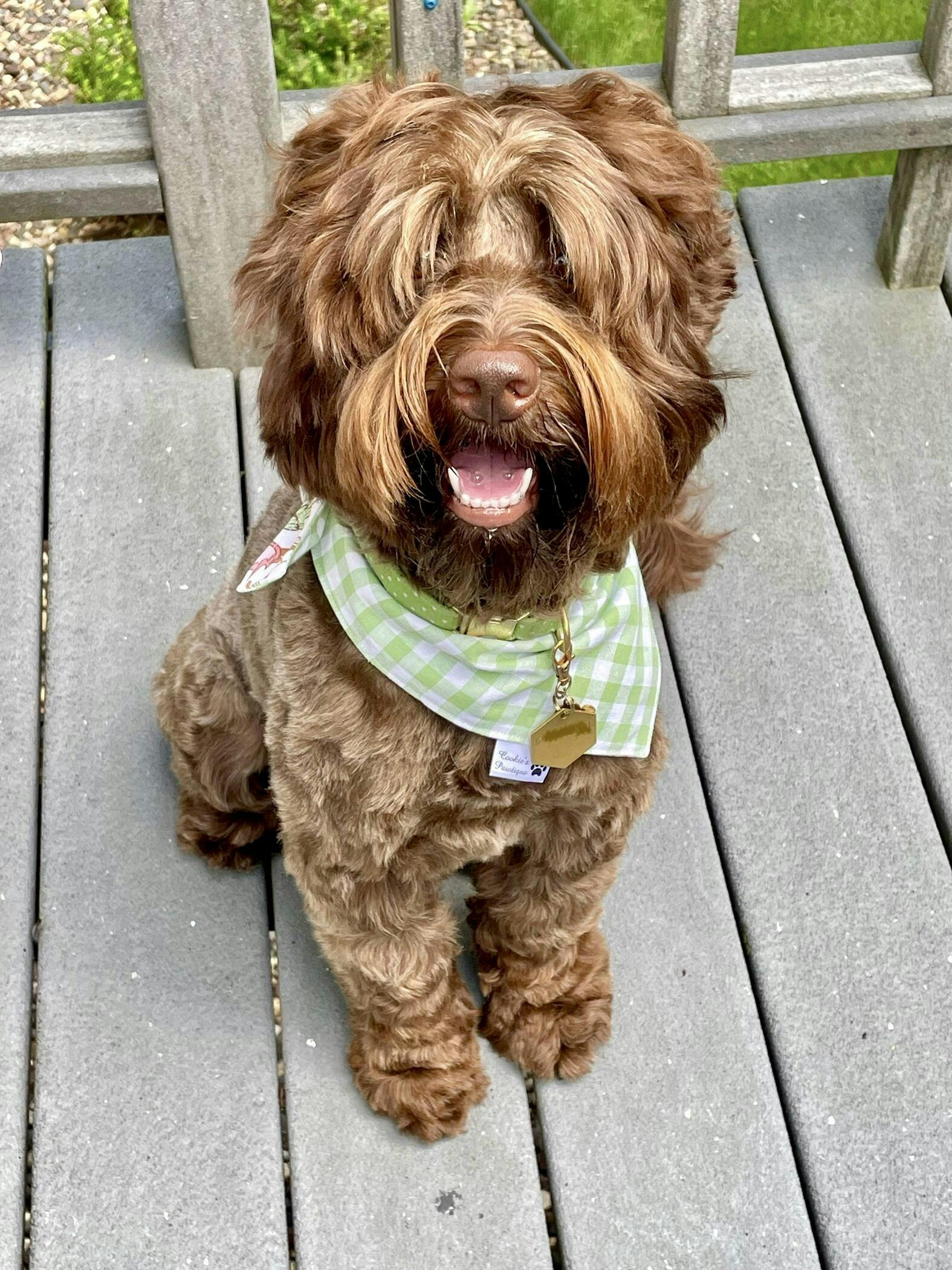 The Happy Camping bandana has two cute patterns—one side has little campers, evergreens, and campfires and the other has the cutest light green and white gingham print. I love that all of the bandanas from Cookie's Pawtique are reversible so you are getting two looks with one bandana! The fit is also great since the cut shapes around the dog’s neck so that there is no need to fold over the fabric. The length of the bandana is perfect on my dog—no dragging on the ground if he’s sniffing on a walk. Perfect—will be back for many more!