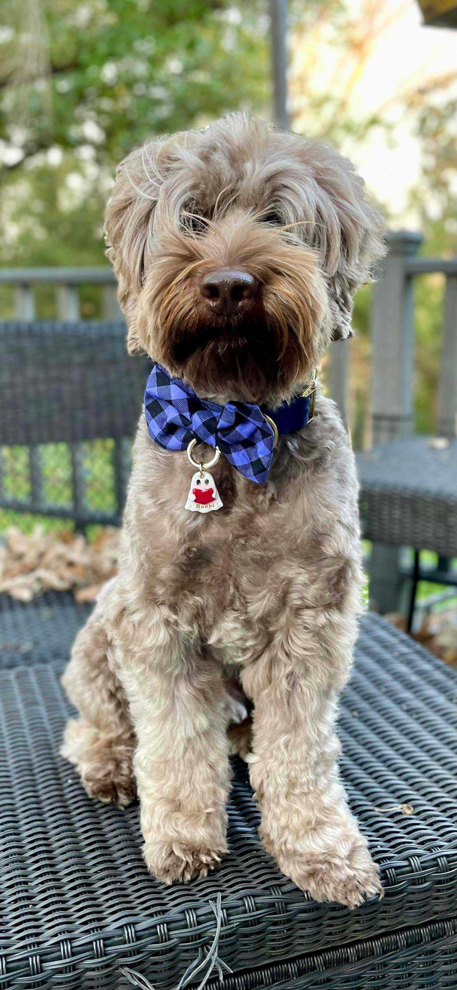 Model Info: Cookie, an 70-pound Golden Retriever with a 19'' neck, is wearing size large sailor bow and bow tie across all our products.