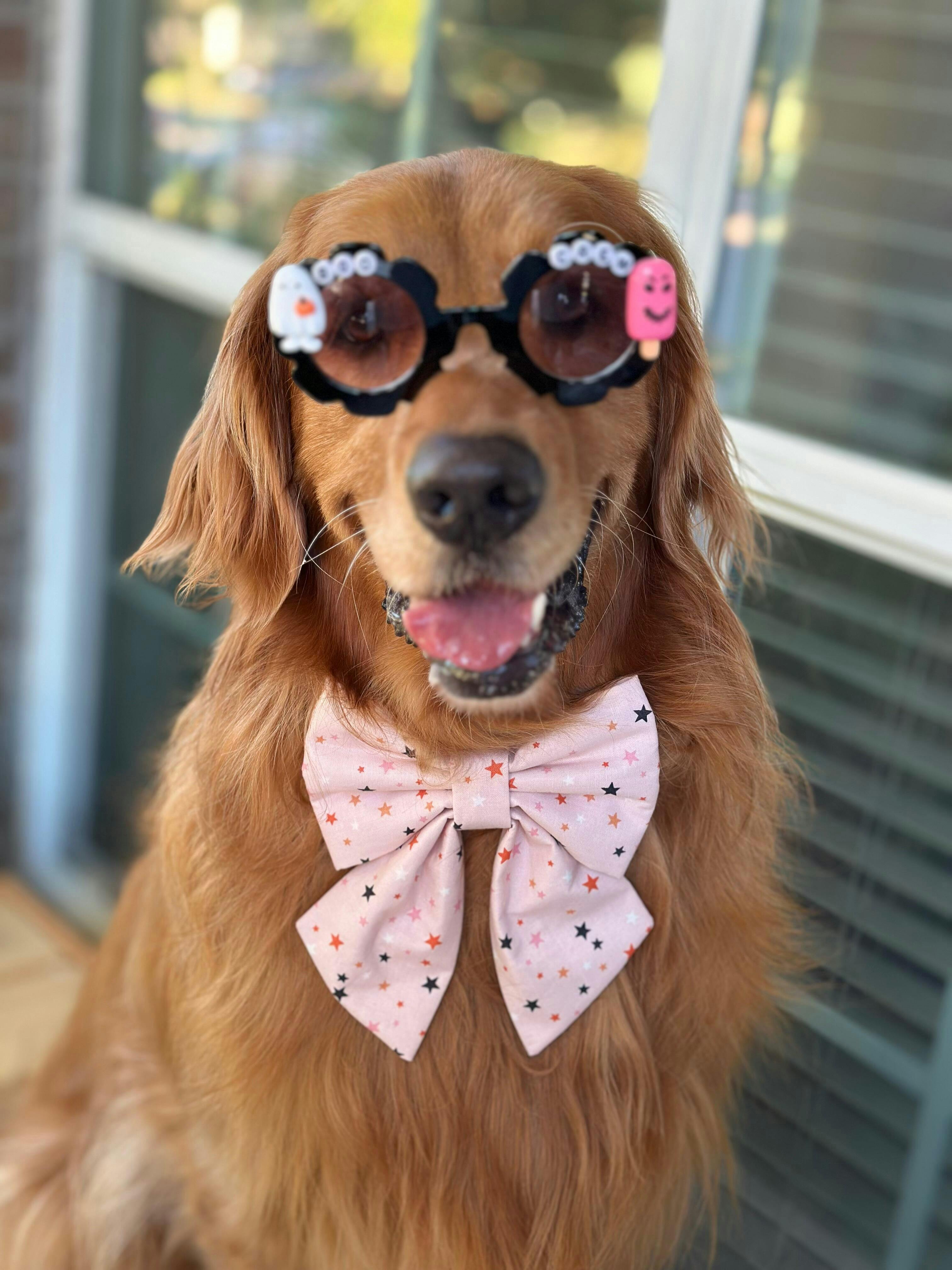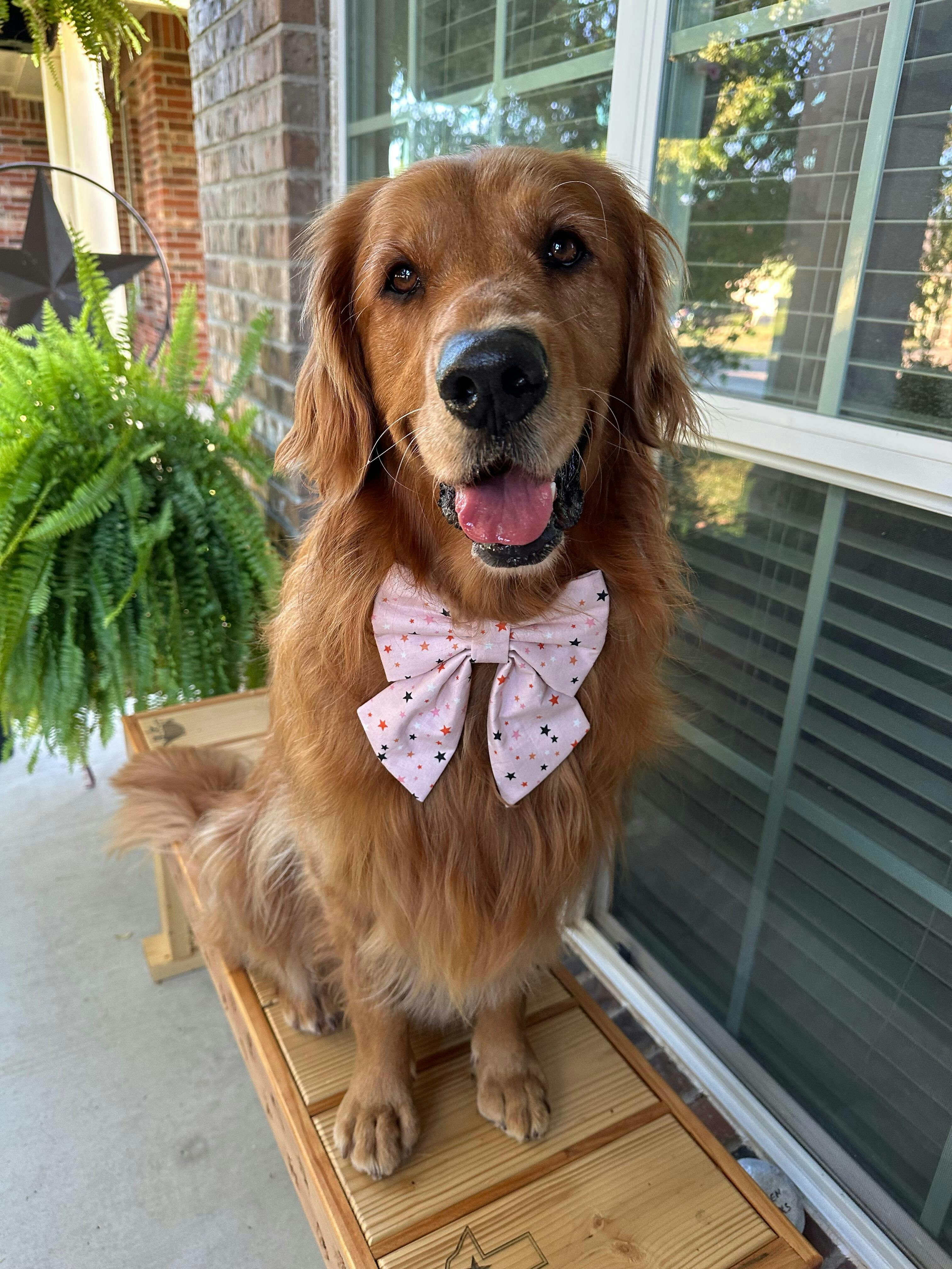 Model Info: Cookie, an 70-pound Golden Retriever with a 19'' neck, is wearing size large sailor bow and bow tie across all our products.
