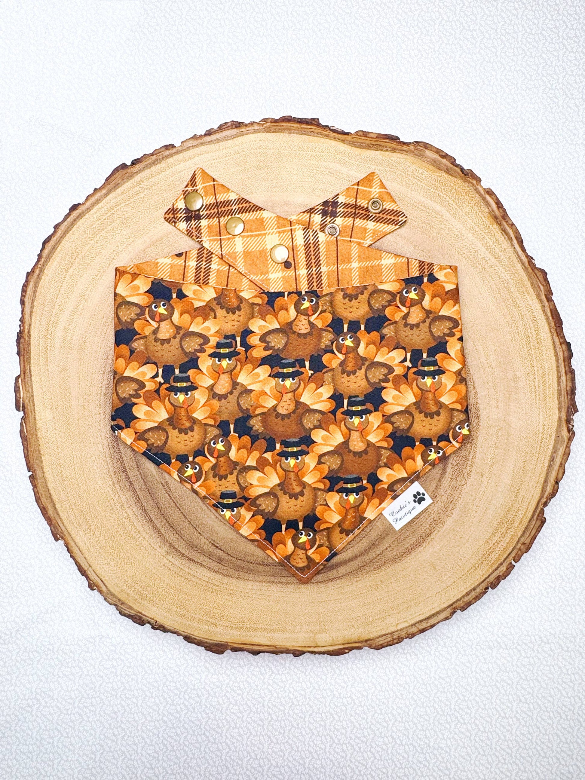 This is a reversible bandana that features two bandanas in ONE! Made with high-quality and trendy fabrics, and designed with your dog's comfort in mind, it is a PAWFECT accessory to add some flair to your best furry friend's look for Thanksgiving.
